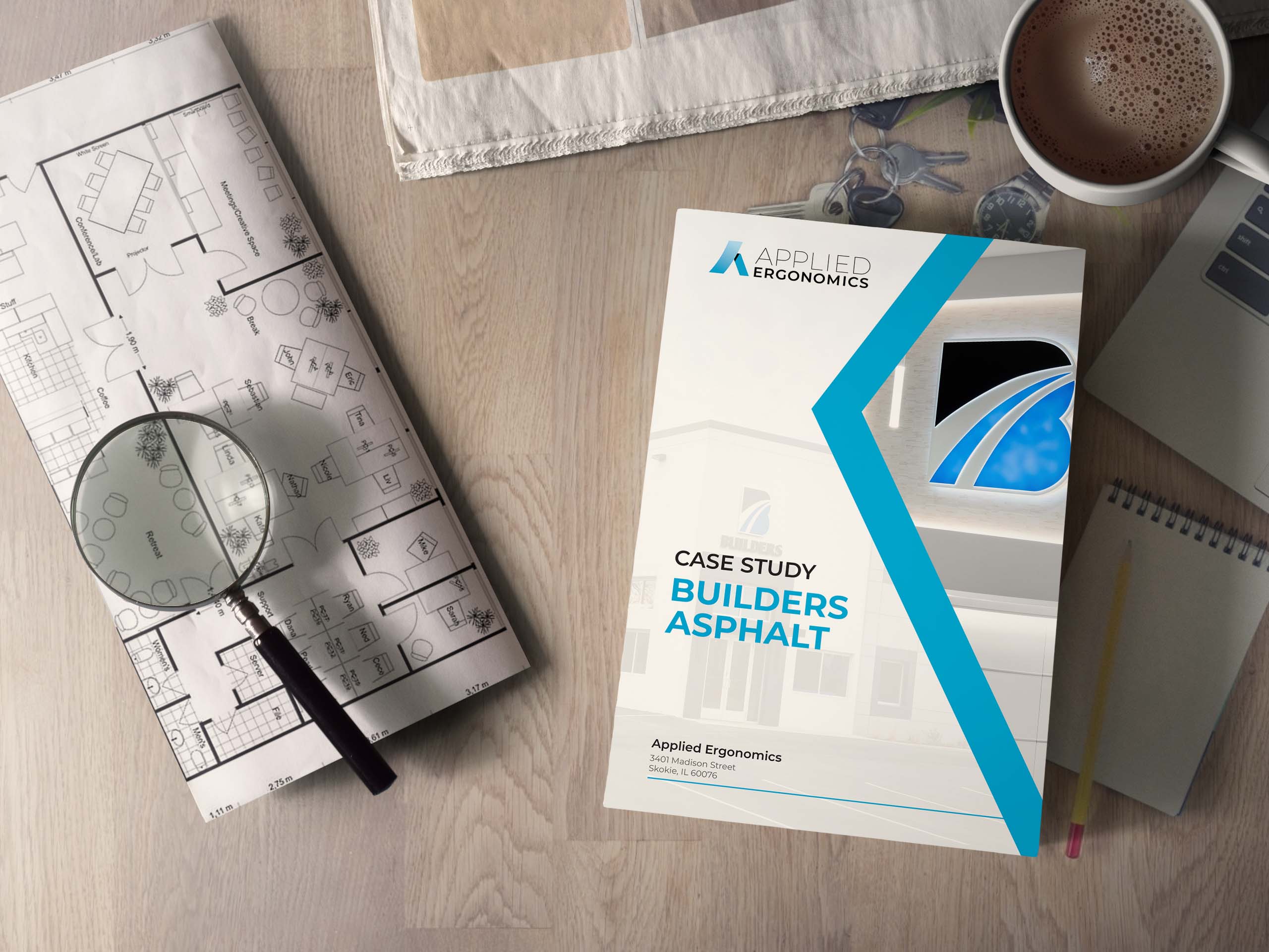 To begin, the Applied Ergonomics designers brought 2D AutoCAD drawings into Sketchup so that all aspects of the interior could be visualized and a look that reflects the client’s company could be created. Builders Asphalt makes most of the asphalt that is used on the roads and highways in the Chicago metropolitan area, selling it to others as well as doing paving themselves.