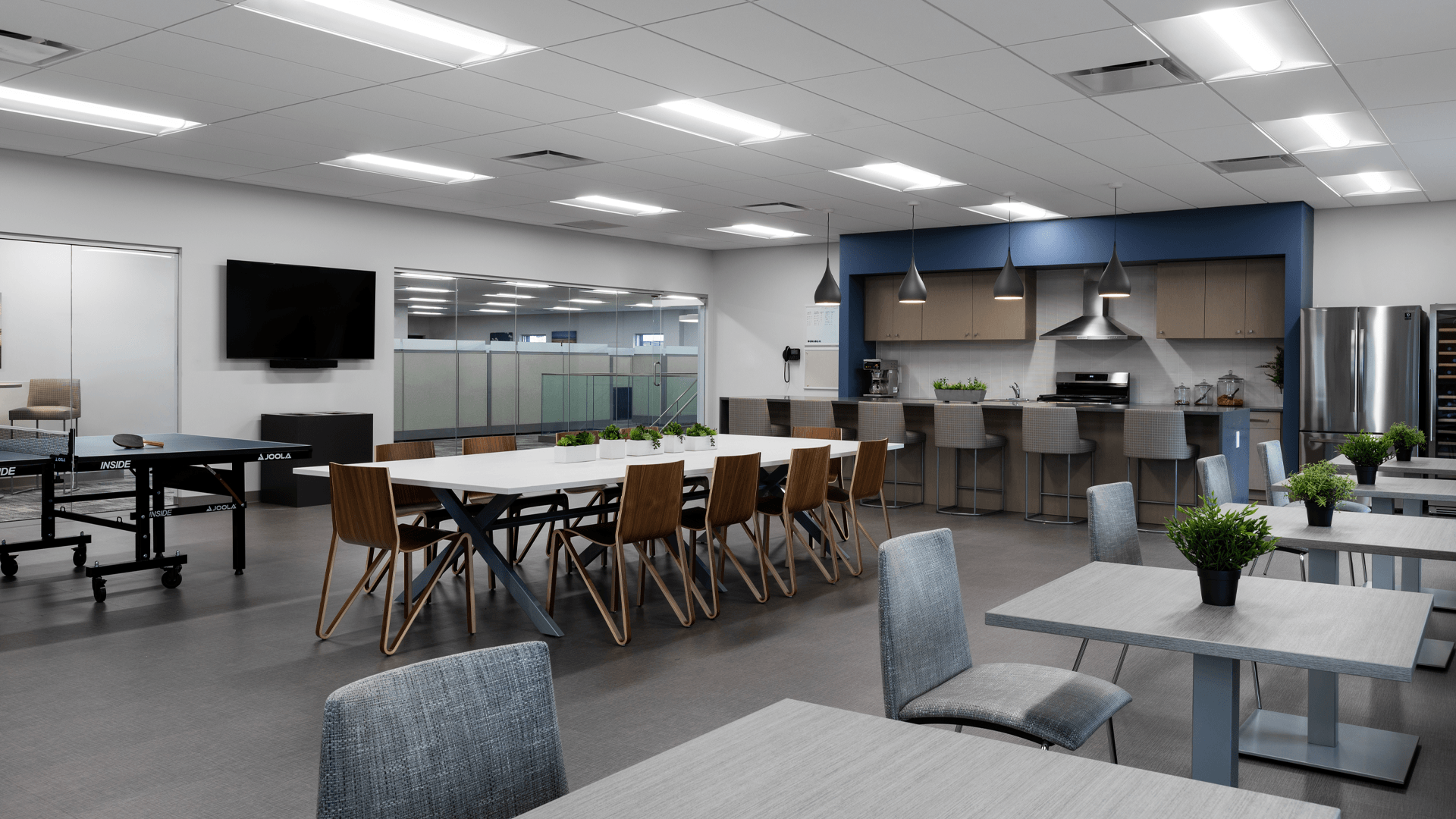 The breakroom was important to the company’s president to bring the whole team together. Thus, the Applied Ergonomics team made every effort to make it beautiful but comfortable and inviting while also incorporating a full kitchen which is stocked with snacks, wine, and goodies.