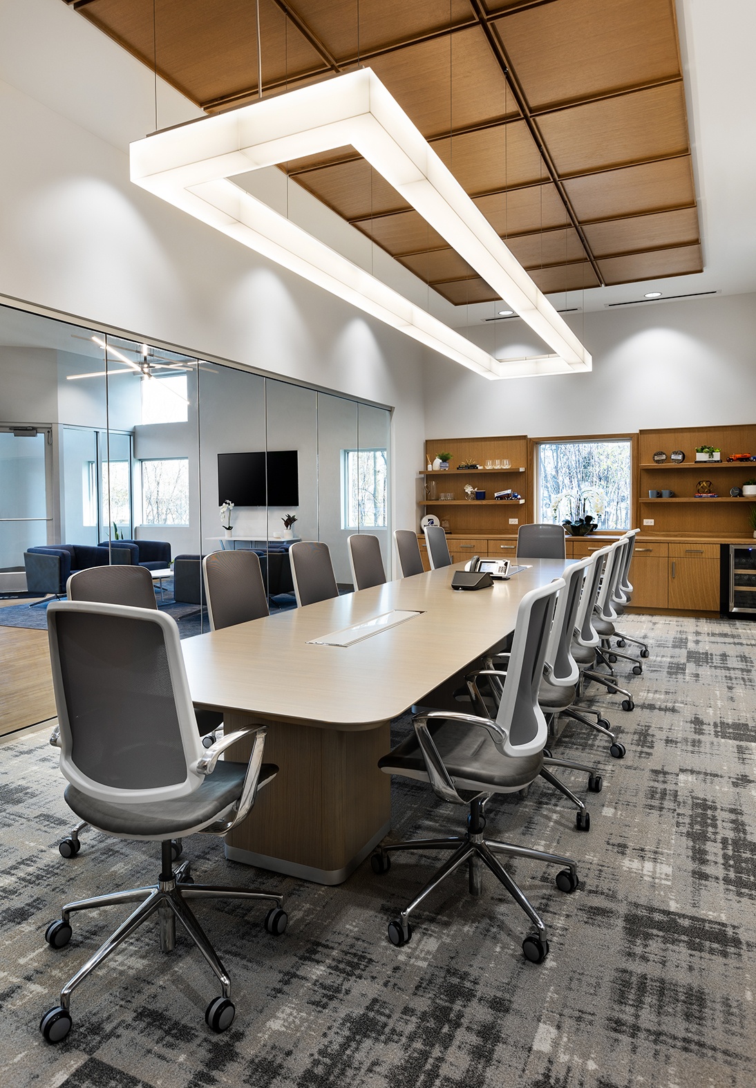 To complement the 13-foot ceilings in the reception and conference room areas, the Applied Ergonomics team customized a light over the conference table to balance the volume of the space.