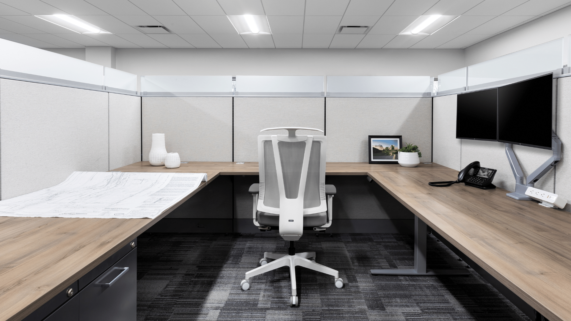 The work areas within each workstation and office are very generous. The workstations are each 9.5’ x 9.5’ with an 88” W x 29” D height-adjustable main desk surface and a 90” W x 36” D rear surface for laying out construction documents like blueprints.