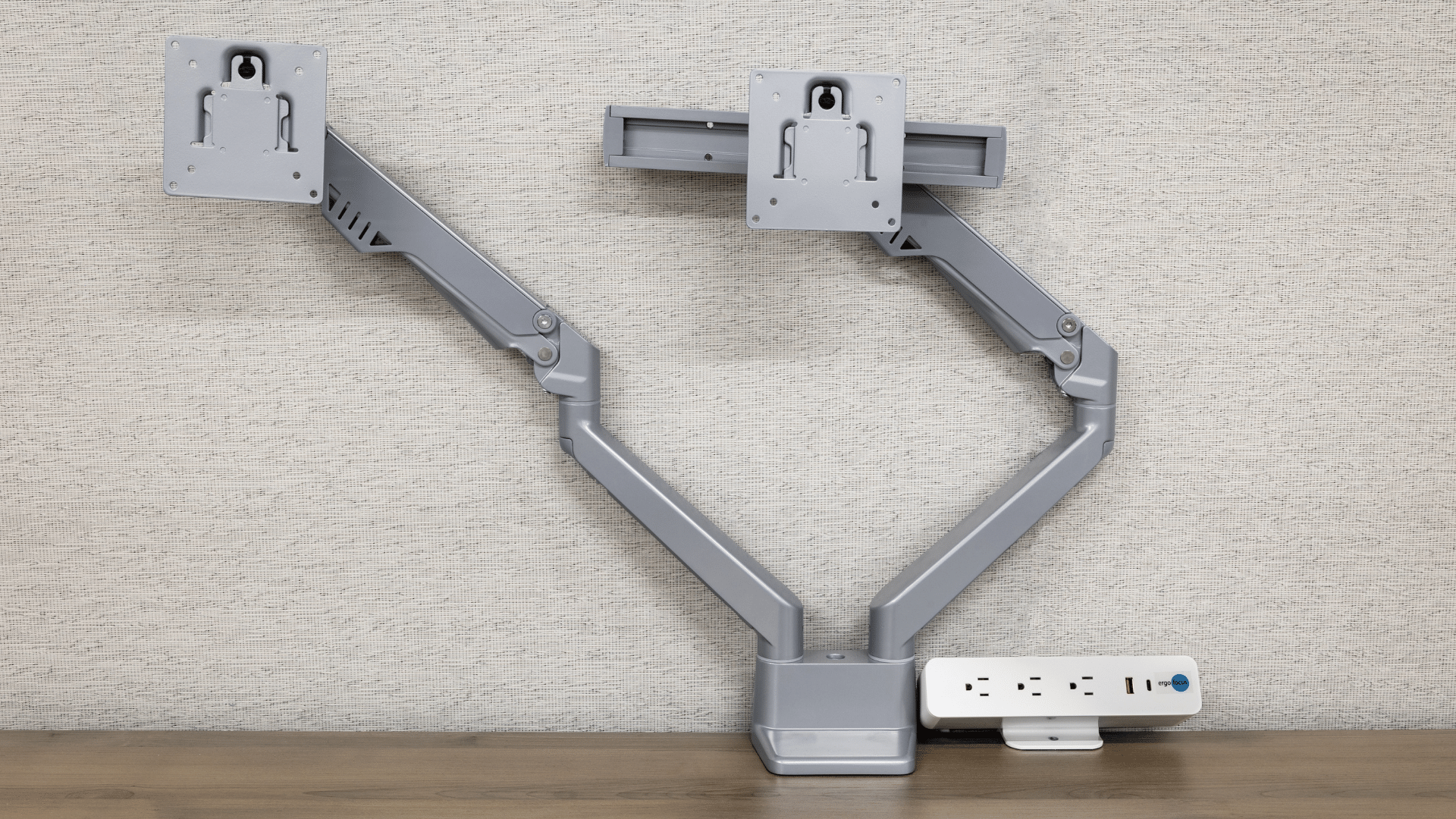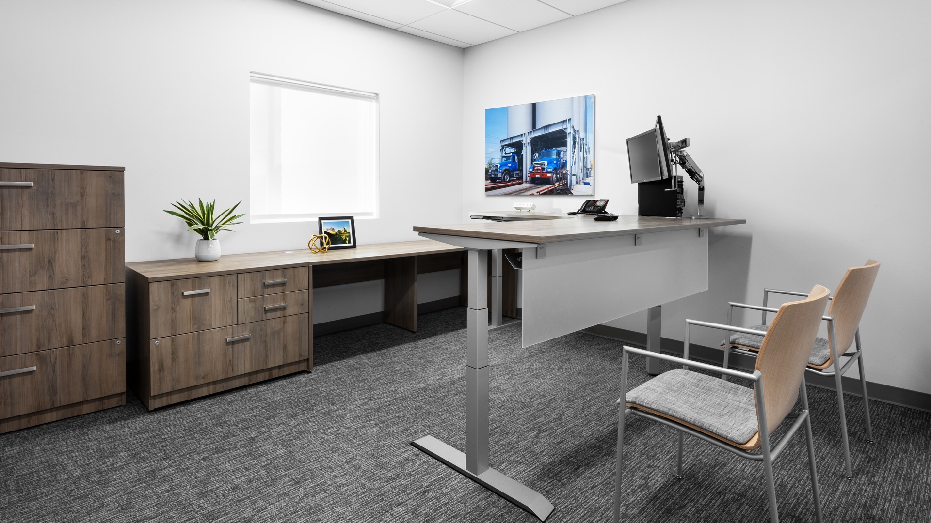 The offices are designed with an oversized 78” x 78” curved corner desk, all height adjustable, and an open-leg 84” W x 30” D rear surface, with a combination storage cabinet past the end of the credenza. These sizes are almost impossible for furniture dealers to accomplish with height adjustable bases, but easy for ergoFocus™ when there’s sufficient lead time.