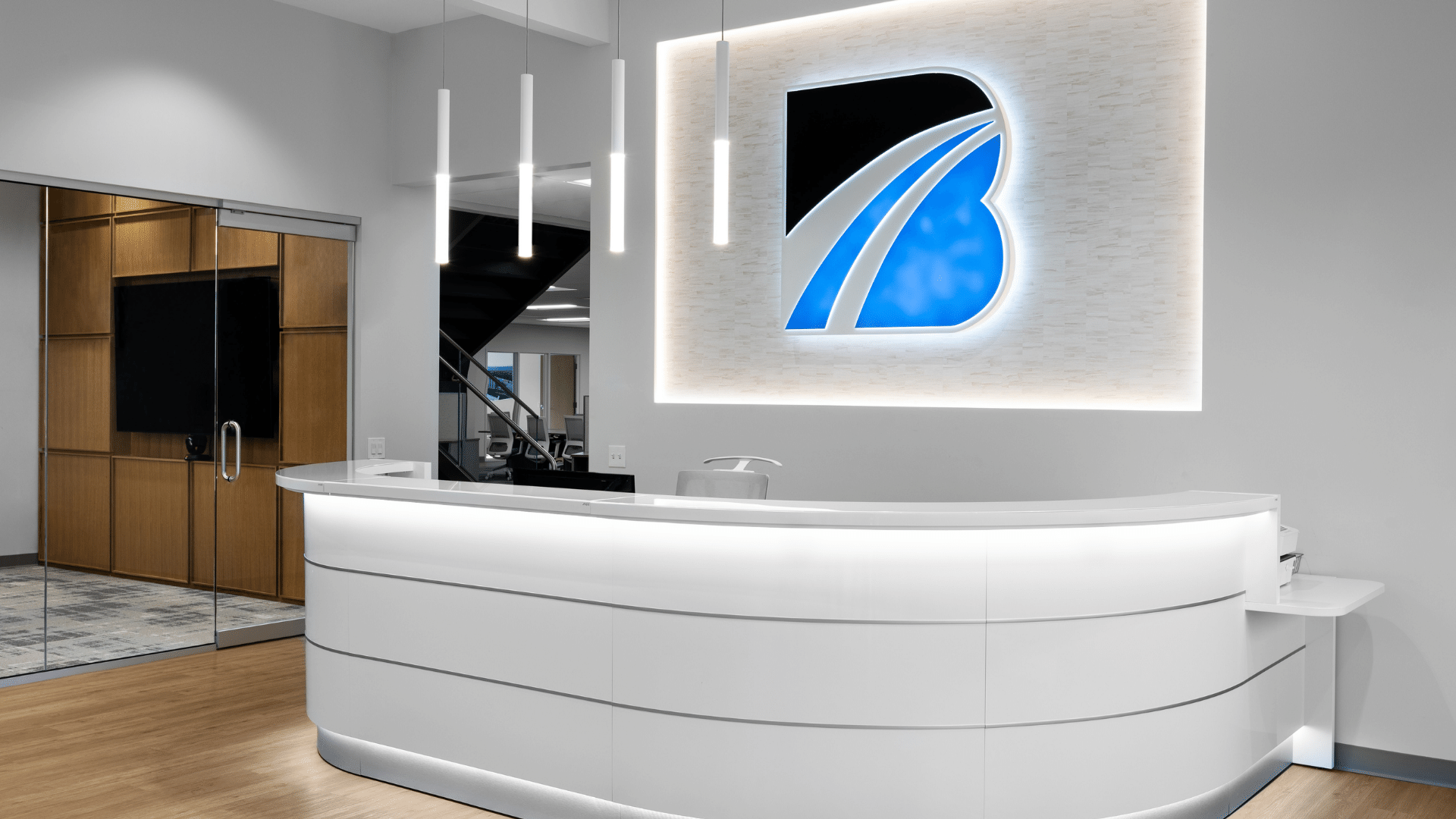 The president of Builders Asphalt is forward-thinking and wanted an exceptionally clean, modern look. Materials that reflect the earth the business is tied to were selected to be juxtaposed with white walls and bright LED lighting.