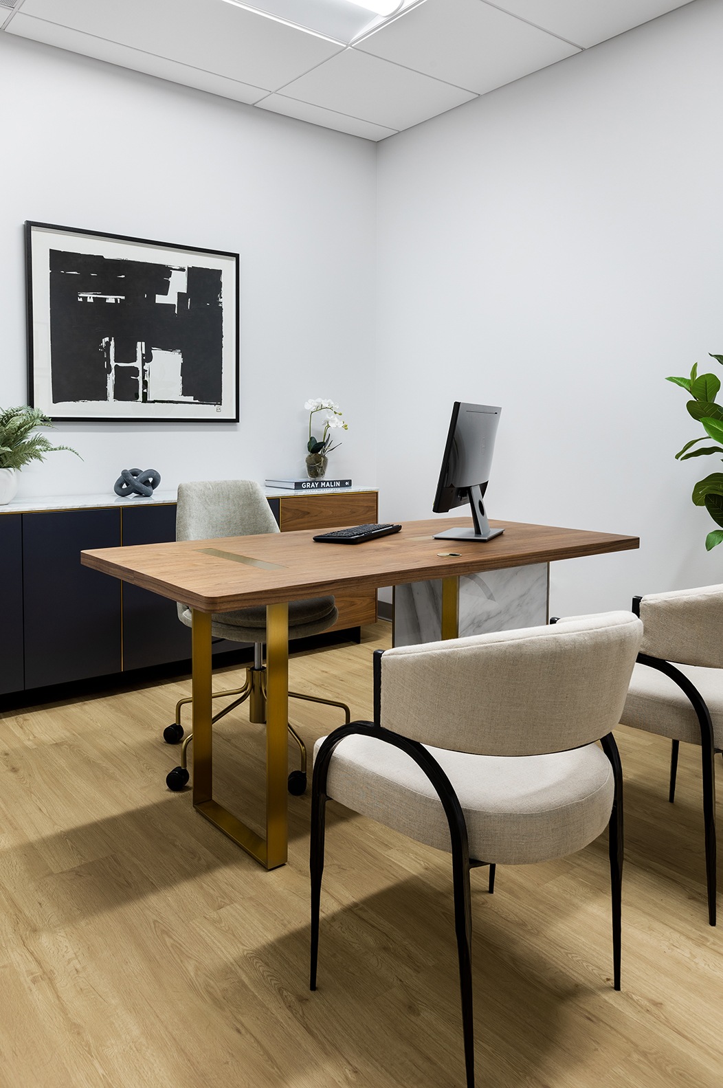 The client wanted a lot included in the president’s office so while the space was quite large, it featured a number of exciting space planning challenges to solve for. Some of president’s desired items included a fixed-height executive desk, sitting area, 6’ round meeting table, and an 80“ TV across the room from the desk.
