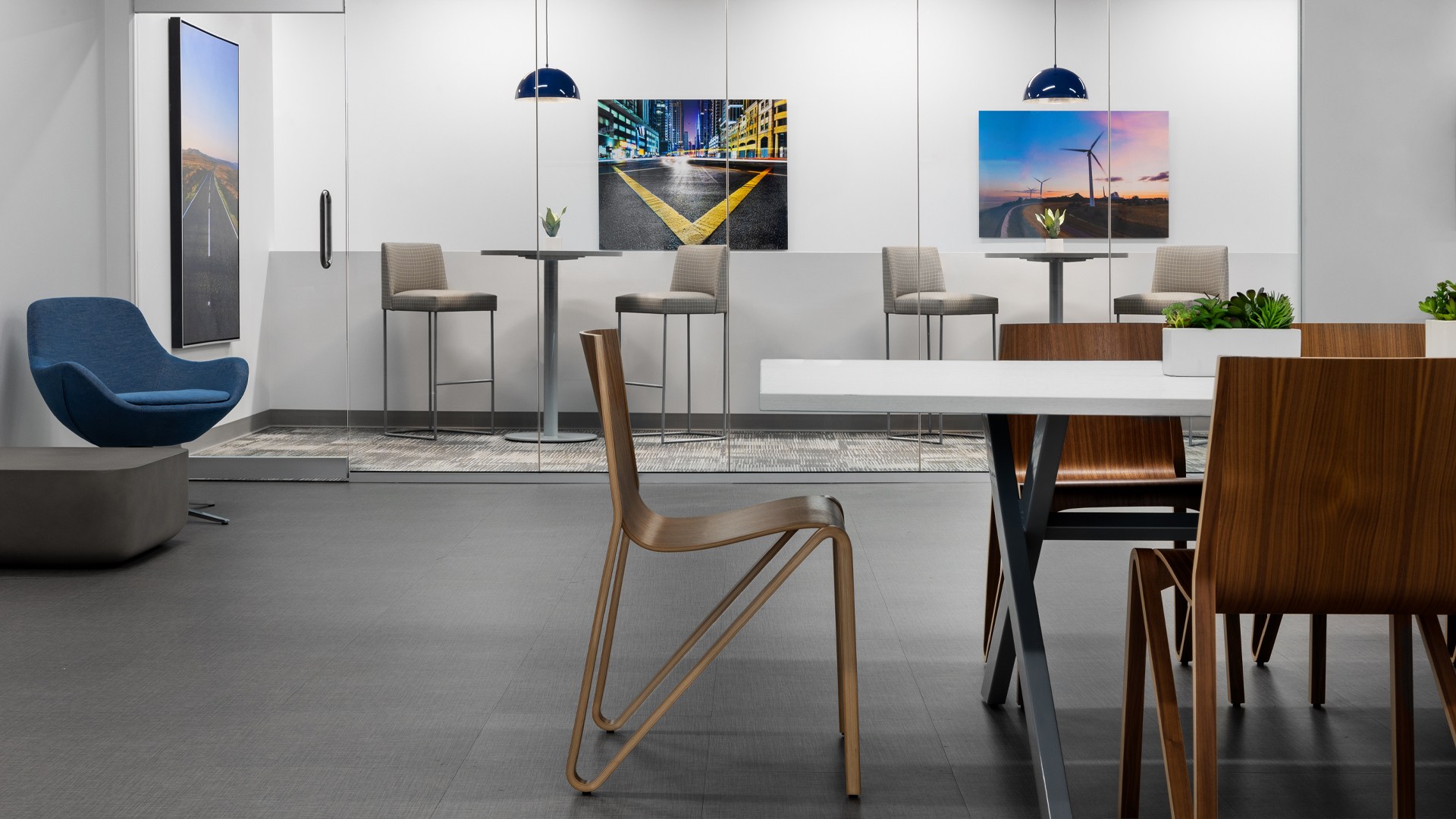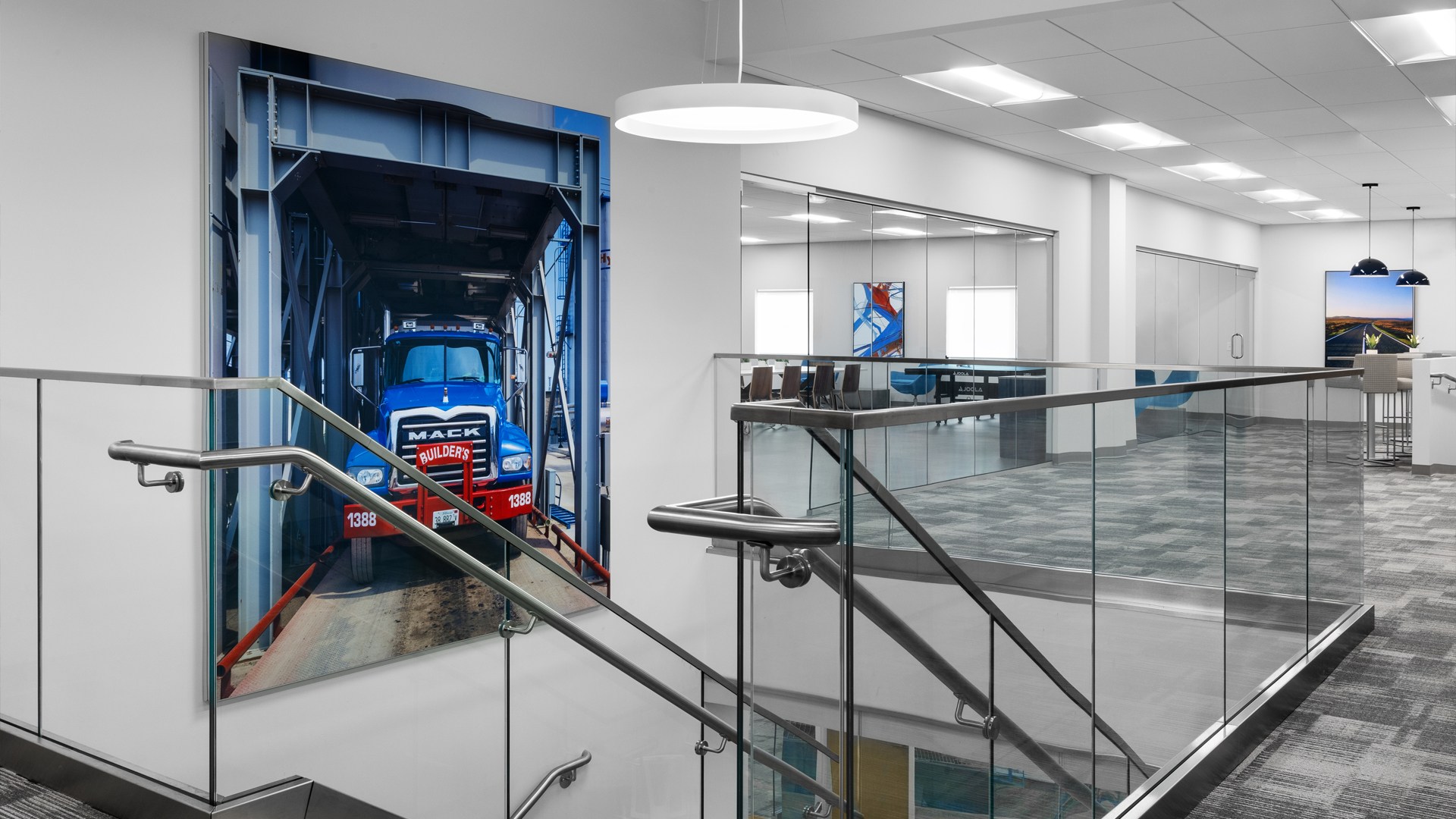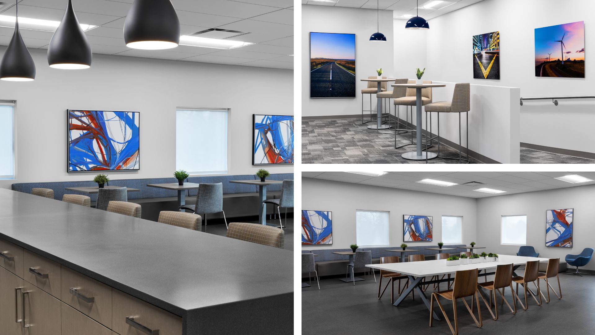 The Applied Ergonomics team designed, specified, and procured the flooring, tile, millwork, and decorative lighting. Likewise, in collaboration with the client’s residential stylist, Laura Flynn of Element Design, who joined on aspects of the project, the AE team designed and provided all of the furniture to embed ergonomic sophistication into the workspaces. And finally, we together developed an art program which incorporated abstract art, artistic photography with roads as their theme, and our own professionally shot photographs of the client’s newest facilities and vehicles as a common thread to tie everything together and reflect the spirit of the company.