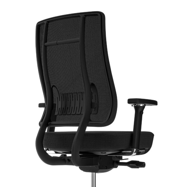 The sculpted back features an integrated adjustable lumbar support that moves up and down with your fingertips while seated. It flexes to provide appropriate, comfortable support.