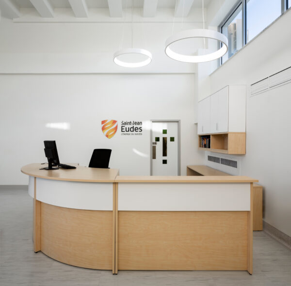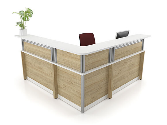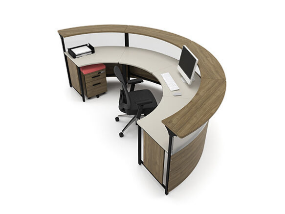 The RZ1 series stands out with its transaction shelves supported by aluminum posts. Acrylic, laminate, and metal accents, with or without embossing, or accessory bars can be integrated into the reception workstation.