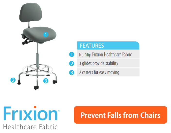 The solution is healtHcentric’s new Frixion Healthcare Fabric. It is the only healthcare fabric that can be called ergonomic in that it allows the user to stay firmly positioned in their seat. It also withstands hospital grade cleaners and disinfectants. Ideal for use in clinical areas of hospitals, clinics and labs.