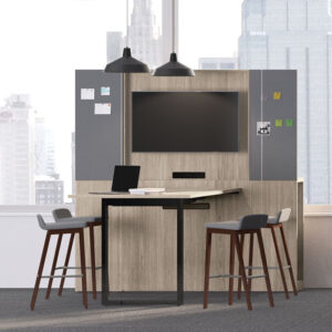 JSI’s Vision was designed prior to Swish and while it works well for open plan spaces, it shines in modern private offices. It is completely modular and offers components in laminate or veneer, or both mixed, with optional heights for low storage and a layered aesthetic. Yet Vision is a chameleon, as the photos show, and can be used to create looks from transitional to edgy, depending on the edge detail, wood stain and components chosen. Vision has hundreds of standard sku’s that combine to create virtually any configuration a designer could want for specifying private offices, as well as collaborative stations, open plan environments, reception, training and conferencing. For extensive power and data routing needs though, look to the second generation Swish. JSI is all made in America, in Jasper Indiana.