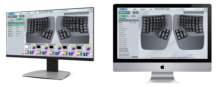 The fully programmable Advantage360 features Kinesis’s new-and-improved SmartSet Programming Engine that allows you to customize the keyboard’s layout without installing any clunky software or special drivers, or accessing the internet. Record macros, remap keys, and much, much more using convenient onboard shortcuts. SmartSet works on all major operating systems and enables users to easily create, view, edit, share, and backup their custom layouts.