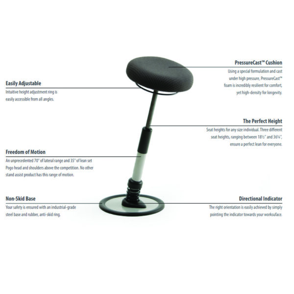 There are a lot of standing supports on the market now, but only a few great ones. The Sitmatic Pogo stands out and is our best-selling option. It has a thick, comfortable seat made with molded foam and excellent mechanism that gives the proper angles for being upright but supported. Sitmatic is based in California and is one of the country’s leading ergonomic seating manufacturers. The Pogo has a lifetime warranty for the structure and years down the road can be sent in for refurbishment.